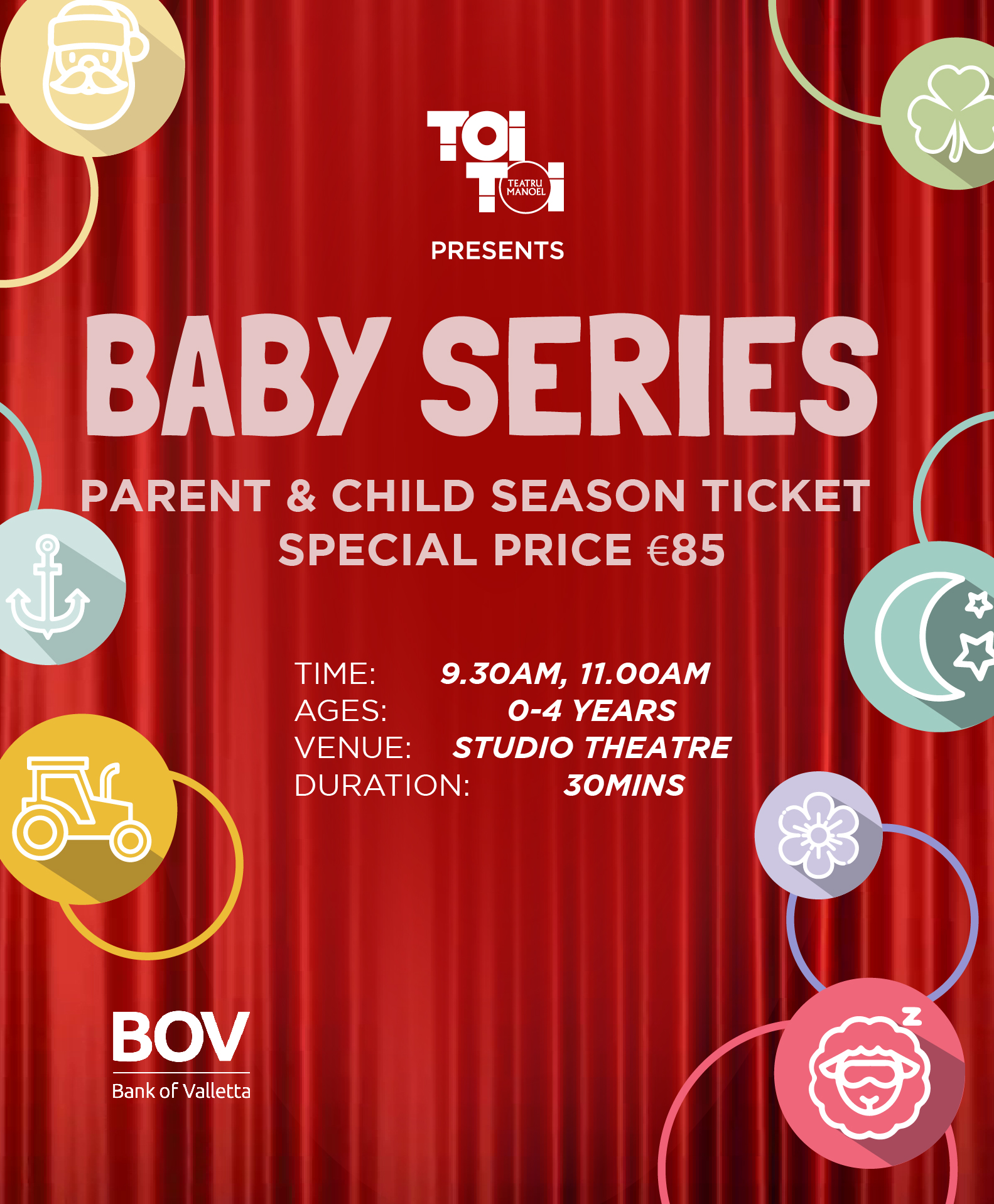 TOI TOI bi pjaċir iħabbar ir-ritorn tal-Baby Series, is-serje ta’ produzzjonijiet iddisinjata għall-iżgħar membri tal-udjenzi tagħna. Dan l-istaġun għandna tmien produzzjonijiet għalikom, li mistennija jwasslu avventuri fejn iż-żgħar tagħna li għandhom inqas minn erba’ snin jistgħu jesploraw il-mużika, id-drama, u ż-żfin.