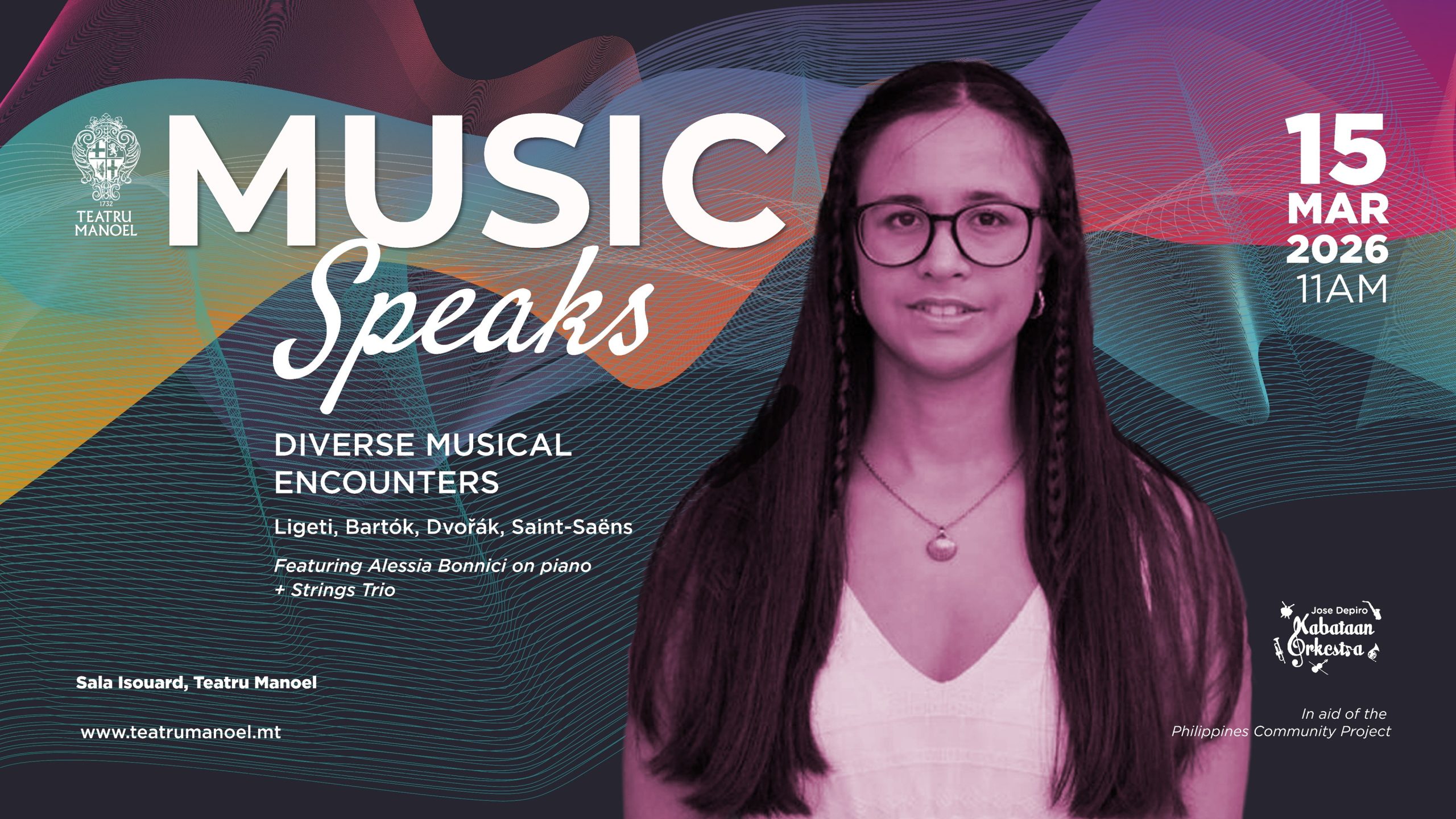 Music Speaks iġib flimkien erba’ artisti żgħażagħ għal vjaġġ mużikali intimu u espressiv. Permezz ta’ xogħlijiet minn kompożituri bħal Ligeti, Bartók, Dvořák, u Saint-Saëns, il-programm jesplora l-kuntrast, l-emozzjoni, u l-konnessjoni bejn dinjiet mużikali differenti. Kull artist iġib miegħu vuċi partikolari, u jistieden lill-udjenza tesperjenza l-mużika bħala lingwa li tgħaqqad u li tmur lil hinn mill-kliem. Il-kunċert ta’ din is-sena jwassal ukoll messaġġ qawwi ta’ solidarjeta’. Il-fondi kollha miġbura se jingħataw lil proġett komunitarju fil-Filippini li appoġġja waħda minn dawn l-artisti żgħażagħ – u b’hekk din il-kollaborazzjoni issir ċelebrazzjoni ta’ mużika, inklużjoni, u solidarjetà.